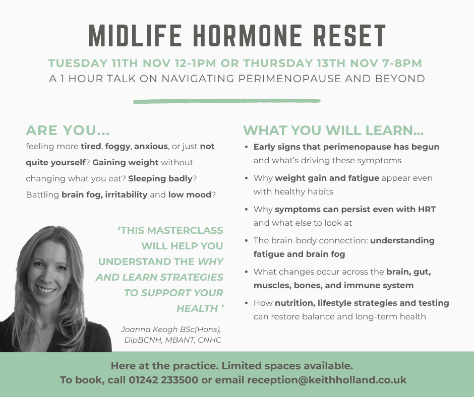 You may be interested in our new online health offering, where you can begin your health journey from the comfort of your own home, with wearable technology and online learning, to empower you to take charge of your health. You will have full 1:1 support from a health practitioner, to help you get to the root of your health issues. Find out more at www.myhealthplatform.co.uk